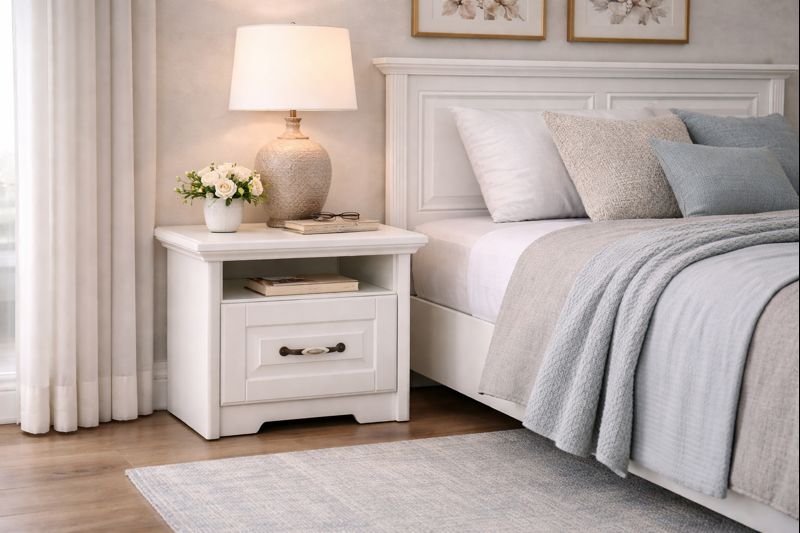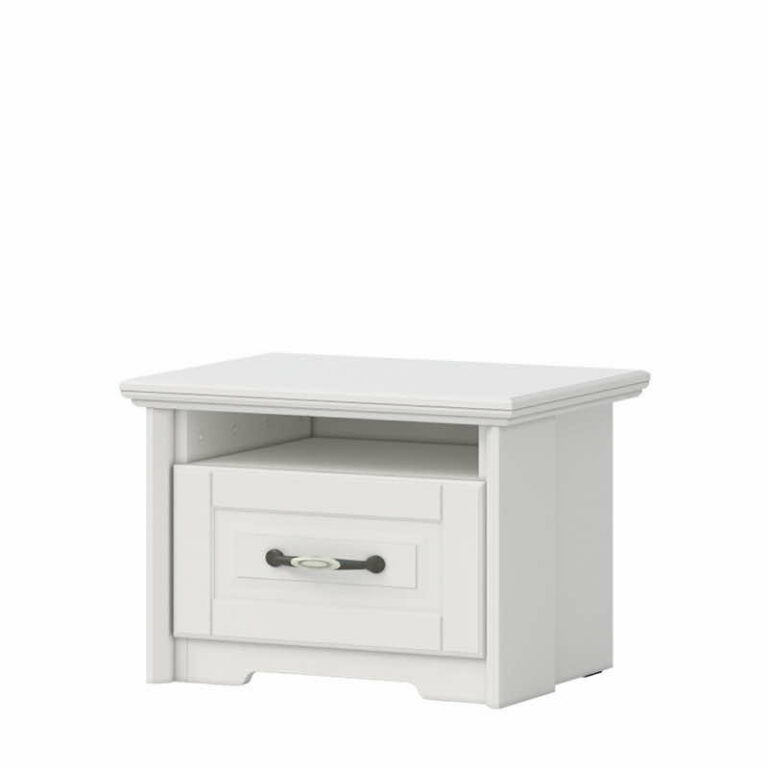 Noćni stočić sa fiokom u koju je ugrađen skriveni klizač sa usporivačem za tiho zatvaranje i stilizovanom metalnom ručicom R19, izrađen je od univera u dekoru Polarni Bor, debljine 18mm. Stilizovani front, dekorativna pokrivna ploča i profilisane lajsne od medijapana debljine 25mm, presvučene su kvalitetnom mat folijom u boji slonove kosti. Iznad fioke noćnog stočića postoji otvorena pregrada, gde možete odložiti svoju omiljenu knjigu.