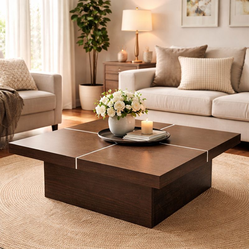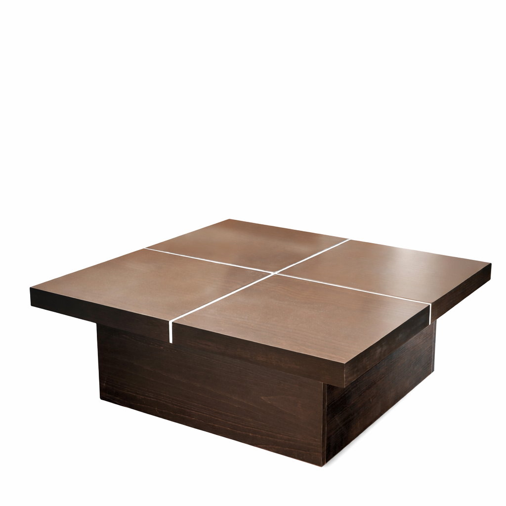 Klub sto modernog dizajna ističe se čistim linijama i skladnom kombinacijom tamnog drveta i dekorativnih belih linija na gornjoj ploči. Kvadratna forma daje mu stabilan i masivan izgled, dok kontrast između ploče i postolja doprinosi elegantnom, savremenom karakteru.
