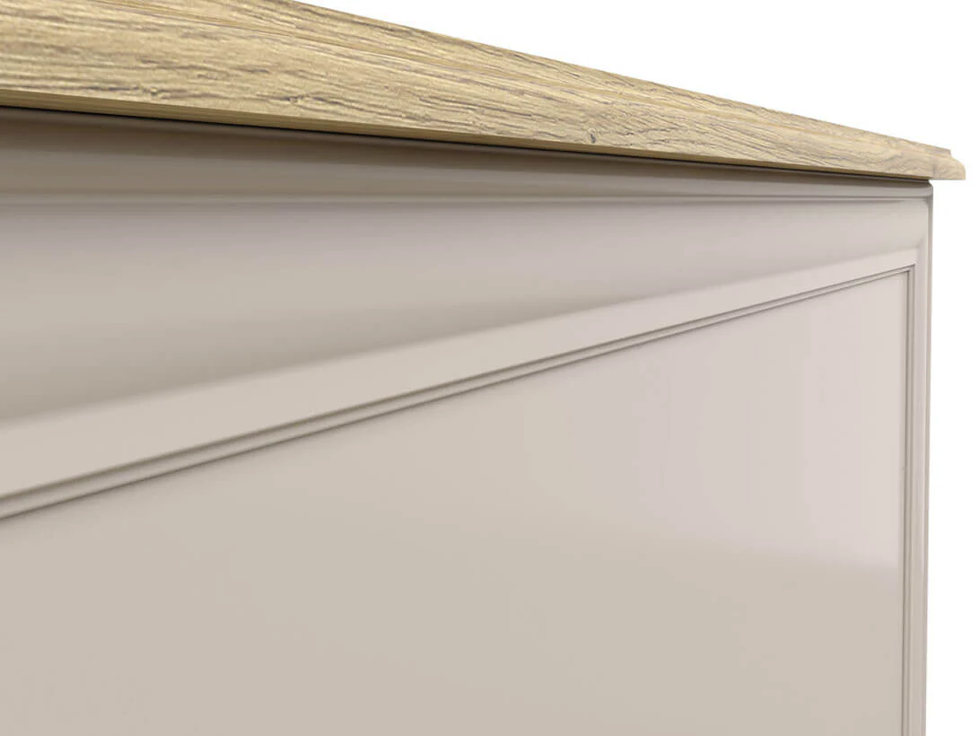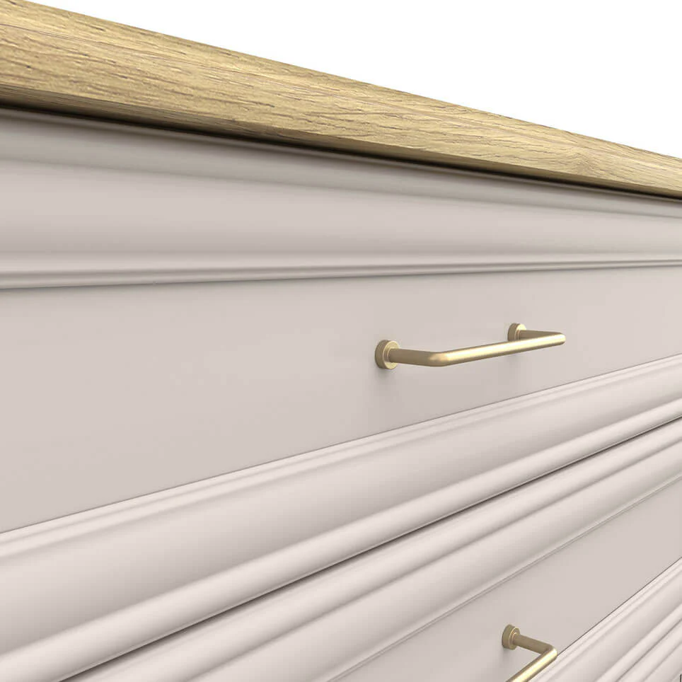 Komoda ANGA predstavlja savršen spoj klasične elegancije i funkcionalnog dizajna, osmišljena da unese sofisticiranost i toplinu u svaki enterijer. Svetli tonovi u kombinaciji sa prirodnom drvenom pločom stvaraju harmoničan kontrast koji prostoru daje osećaj luksuza i udobnosti.