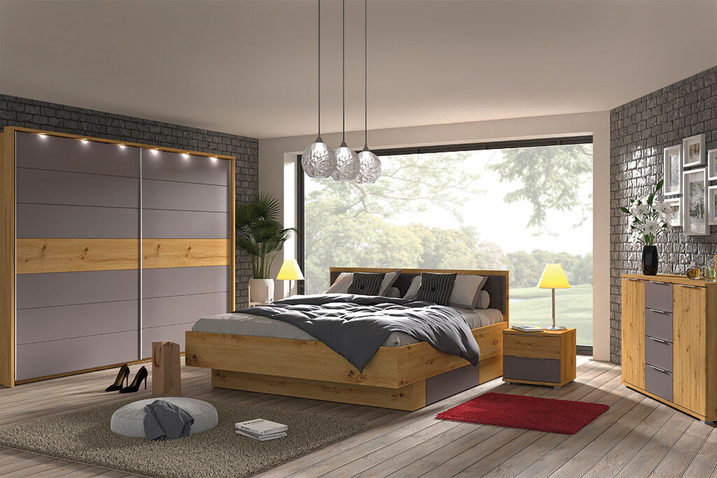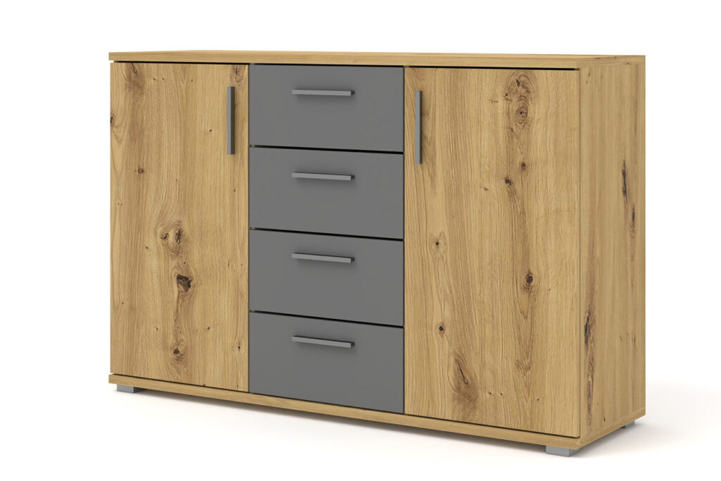 Moderna komoda funkcionalnog dizajna kombinuje prirodan dekor drveta sa elegantnim, mat frontovima u neutralnoj nijansi, stvarajući savršen balans topline i savremenog izgleda. Centralni deo sa fiokama pruža praktičan i pregledan prostor za odlaganje, dok bočni ormarići omogućavaju dodatni kapacitet za veće predmete.