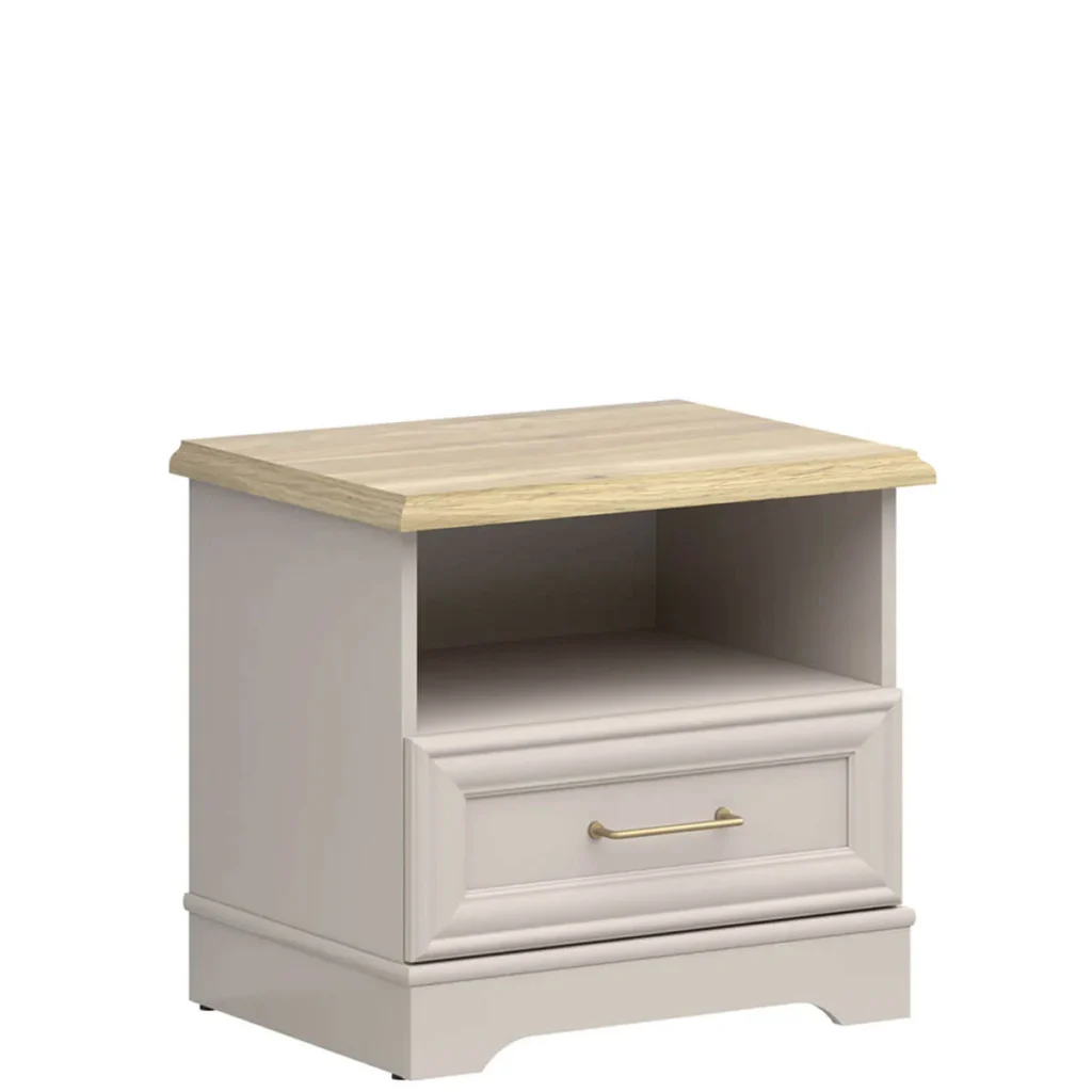 Noćni ormarić ANGA odiše suptilnom elegancijom i funkcionalnošću, savršeno se uklapajući u ambijent spavaće sobe istoimene kolekcije. Njegov klasično oblikovan dizajn, sa nežnim profilacijama i svetlim tonovima, unosi osećaj topline i sofisticiranosti u prostor.