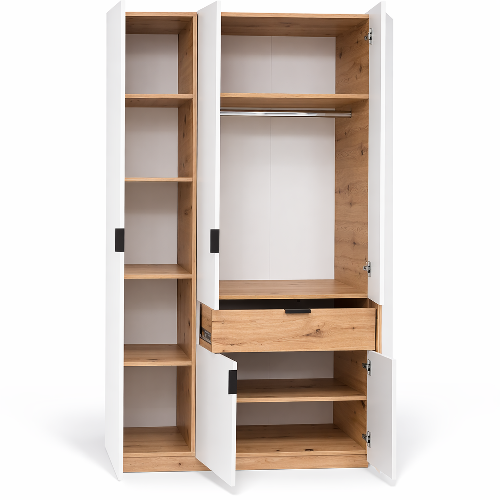 Plakar BON sa 3 vrata i fiokom predstavlja savršen balans stila, praktičnosti i savremenog dizajna — karakteristike koje bi trebalo da poseduje svaki moderan plakar u domu. Sa svojom funkcionalnom formom i čistim linijama, ovaj model nudi izvanrednu organizaciju i idealno se uklapa u moderne, klasične ili minimalističke enterijere.