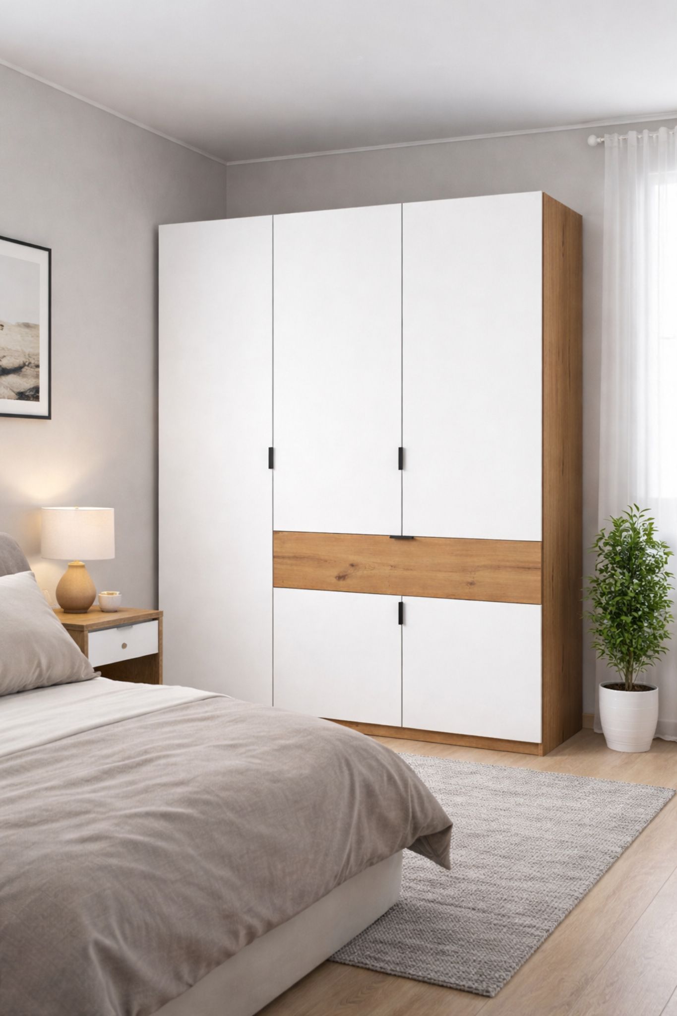 Kombinacija svetlih belih vrata i toplog drvenog dekora (Sonoma ili drugi izbor) stvara vizuelno prijatan kontrast i unosi svežinu u prostor. Ručke i ramovi su diskretni, u crnoj nijansi, što mu daje elegantan i moderan dodir.