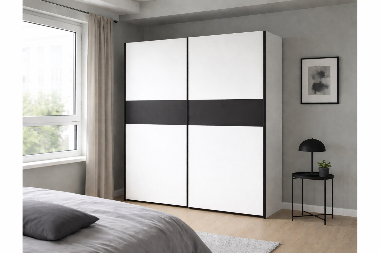 Moderan klizni ormar u beloj boji sa crnom akcent trakom predstavlja savršen spoj elegancije i funkcionalnosti, idealan za savremene spavaće i dečije sobe. Čiste linije i kontrastna crna traka daju ormaru sofisticiran i bezvremenski izgled koji se lako uklapa u različite stilove enterijera.
