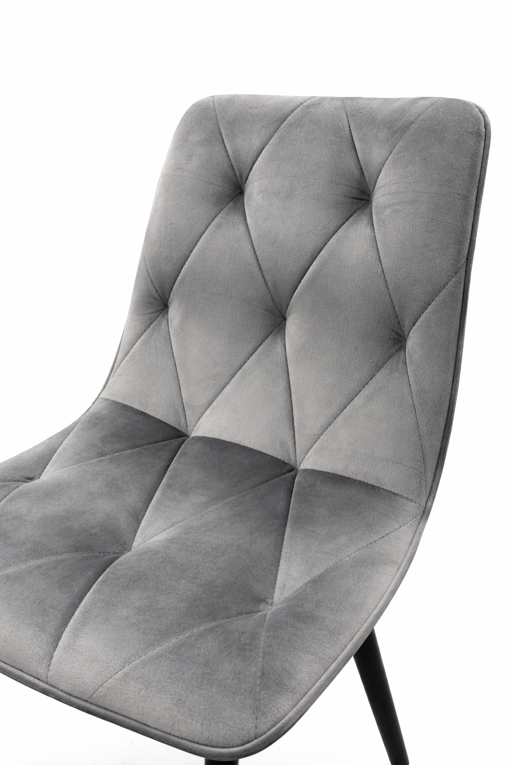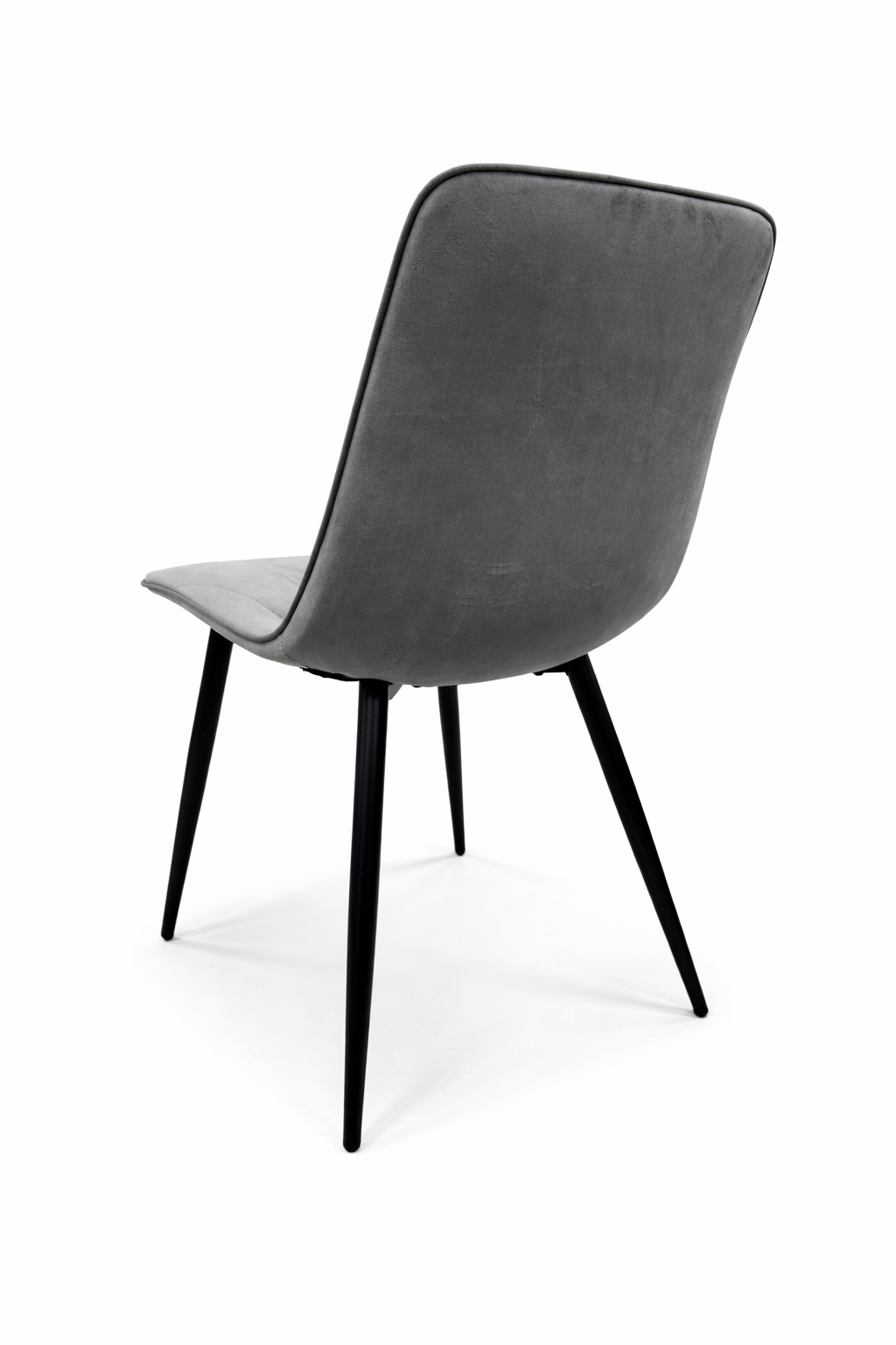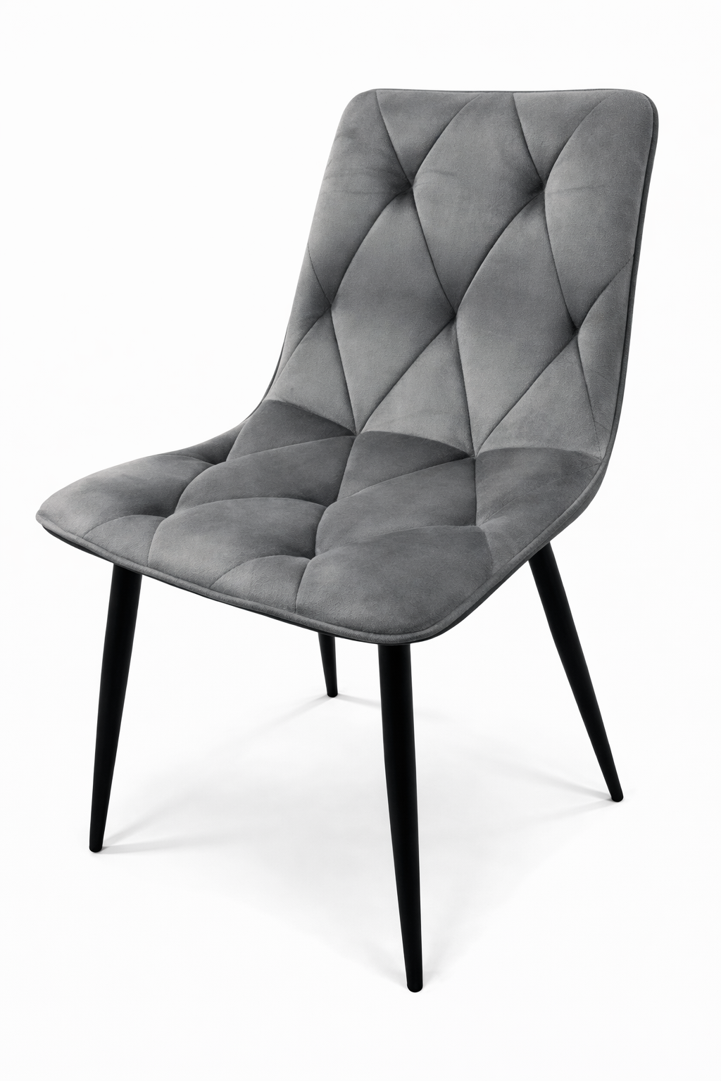 Elegantna tapacirana stolica sa naslonom i sedištem u dekorativnom šavu koji stvara moderan dijamantski uzorak. Nosi je čvrst ram sa tankim metalnim nogarama, blago zakošenim radi dodatne stabilnosti i vizuelne lakoće. Kombinacija udobnog oblika i minimalističkog dizajna čini je pogodnom i za trpezarijske i za radne prostore.