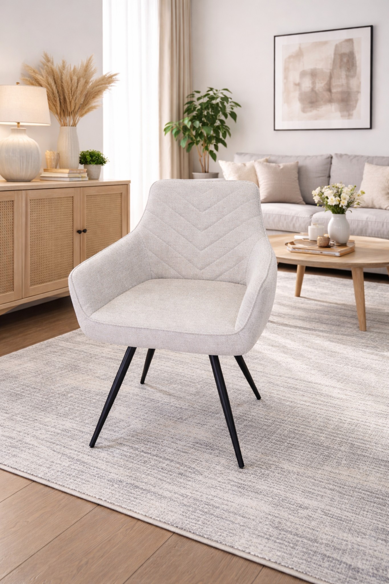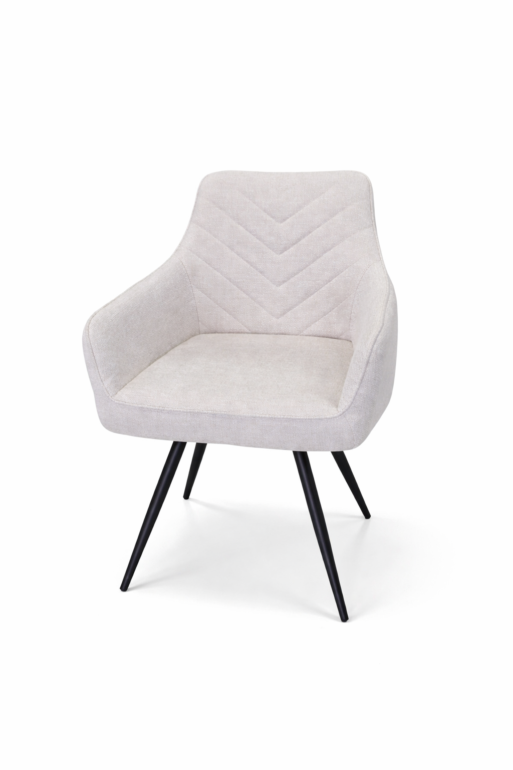 Elegantna trpezarijska stolica modernog dizajna koja spaja udobnost i estetiku. Presvučena je kvalitetnim štofom u nežnoj bež nijansi, sa dekorativnim štepom u „V“ formi na naslonu koji dodatno naglašava sofisticiran izgled. Sedalni deo sa žičanim jezgrom.